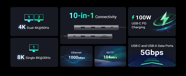 Docking Station USB-C 10 trong 1: Khai thác tối đa tiềm năng của cổng USB-C trên máy tính xách tay của bạn với hai cổng HDMI, một cổng USB-C PD 100W, một cổng USB-C 5Gbps, một cổng USB A 3.0, hai cổng USB A 2.0, RJ45 và đầu đọc thẻ SD/Micro SD