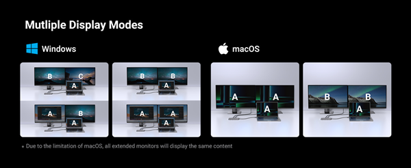 Màn hình đa màn hình: Docking Station sẽ kết nối hai màn hình với cả hai cổng HDMI ở mức tối đa 4K@60Hz. Kết nối với một màn hình duy nhất qua HDMI 2 để xem nội dung ở mức tối đa 8K@30Hz. Xin lưu ý rằng do hạn chế của MacOS, tất cả các màn hình mở rộng sẽ hiển thị cùng một nội dung khi kết nối MacBook.