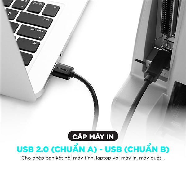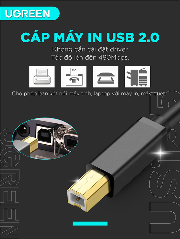 - Cáp máy in USB 2m đầu mạ vàng chính hãng Ugreen 20847 cao cấp cho phép bạn kết nối thiết bị của bạn, giống như USB 2.0 hub, đầu đọc thẻ, máy in, máy quét vv, để máy tính của bạn với tốc độ lên đến 480Mbps. Dây cáp được bọc ba lớp bảo vệ để giảm thiểu EMI và nhiễu.