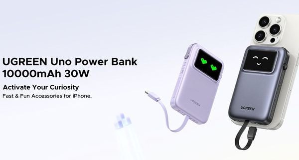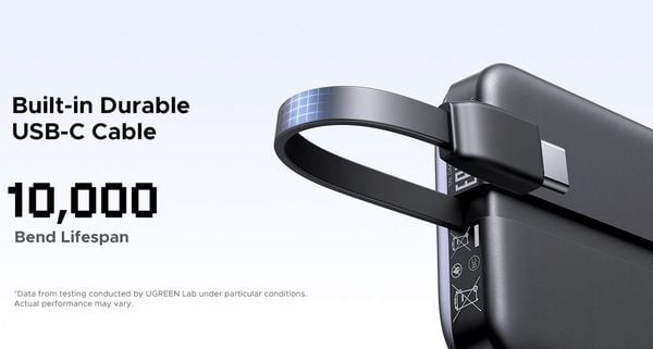 Thiết kế tích hợp: Bộ sạc di động Ugreen có cáp sạc USB C dài 1,6 ft tích hợp, giúp việc sạc thuận tiện hơn, nó cũng có giao diện USB-A và USB-C, có thể cấp nguồn cho 3 thiết bị cùng lúc, tối đa hóa năng suất
